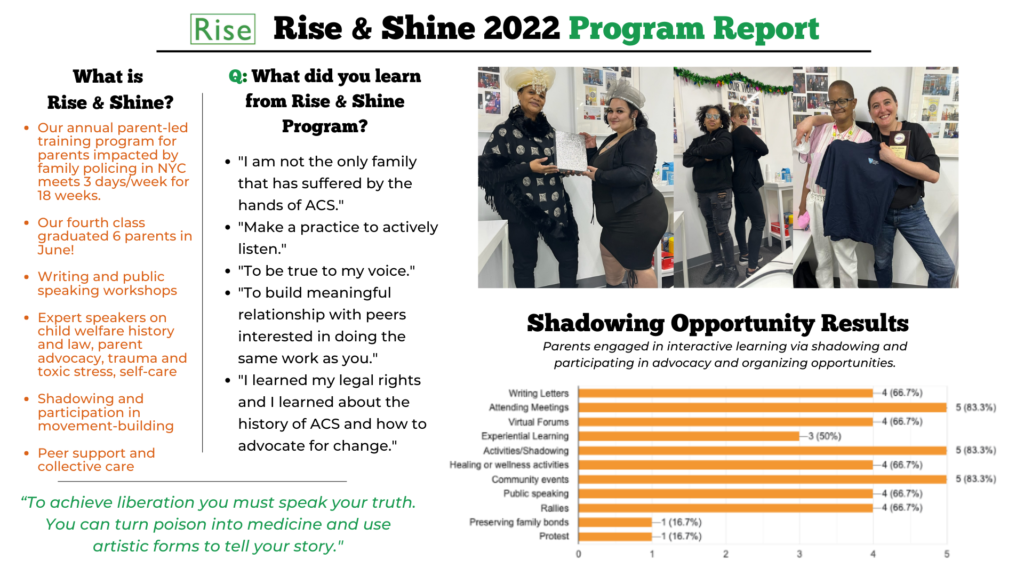 Rise invites NYC parents impacted by ACS to join us for an open house information session this fall to learn about the Rise & Shine Program and how to apply to the 2023 cohort.