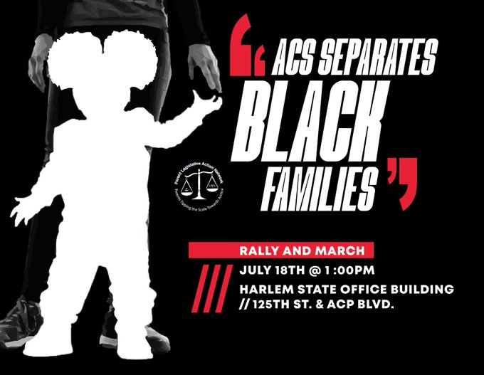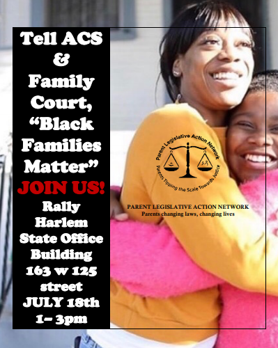 PLAN (Parent Legislative Action Network), led by advocate Joyce McMillan, organized a “Black Families Matter” rally and march on July 18 protesting ACS and family separation.