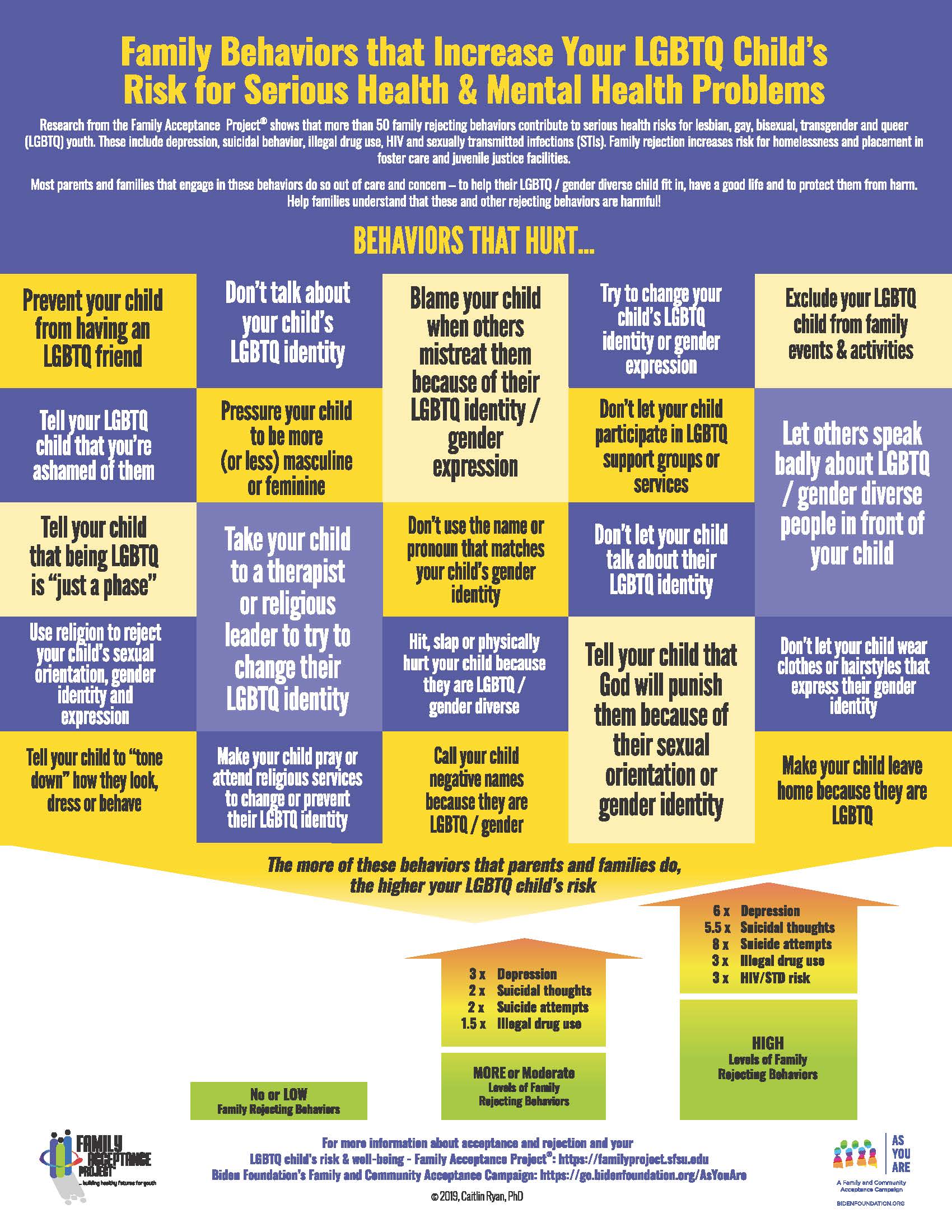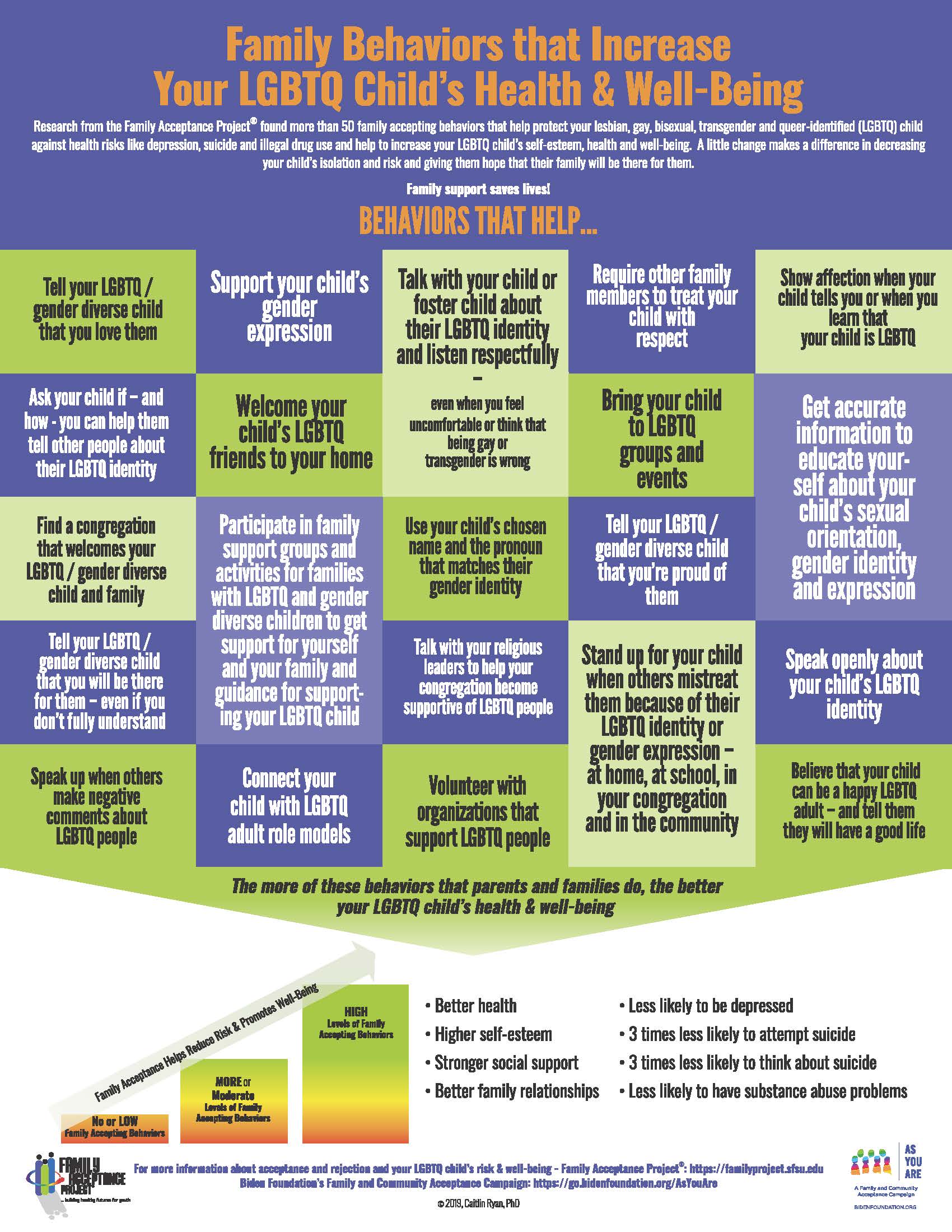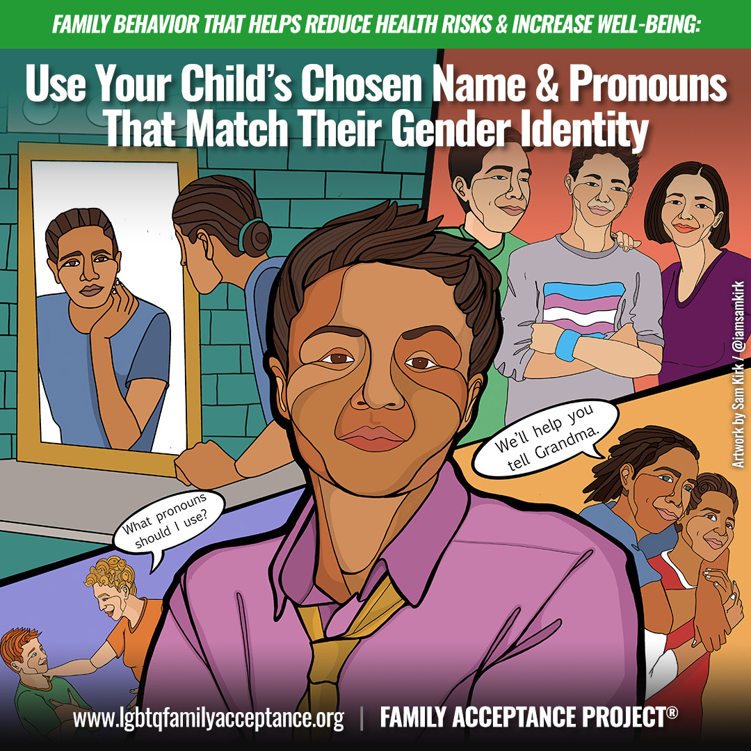 Our research shows that affirming family behaviors increase support and protect against risk— and family rejection contributes to serious health risks. The more rejecting behaviors by families, the higher the level of risk, and the more accepting behaviors by families, the lower the level of risk. Accepting behaviors promote children’s self-esteem, overall health and well-being and family connectedness.
