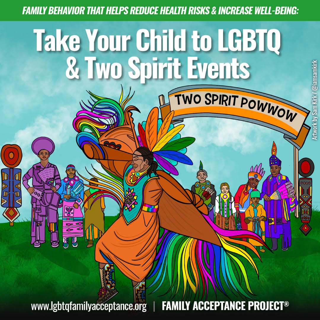 You can take your child to, and/or volunteer at, LGBTQ community events and activities. (Our resources highlight Black Pride, Latinx Pride, a Two-Spirit Pow Wow and Lunar New Year or Diwali, which is a South Asian Festival of Light.) By affirming your child in front of others, you can support your child and help to change attitudes other people may have. Additional affirming behaviors include welcoming your child’s partner and/or LGBTQ friends, validating your child’s clothing and hairstyles and telling your child you’re proud of who they are.