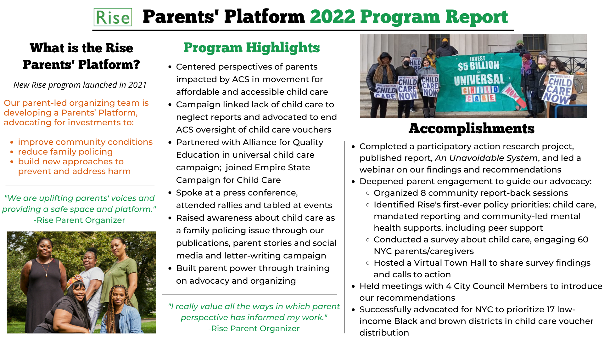 • Identified Rise’s first-ever policy priorities: establishing affordable, accessible child care unaffiliated with ACS; addressing mandated reporting and replacing it with support; and securing investments in community-led mental health supports, including peer support