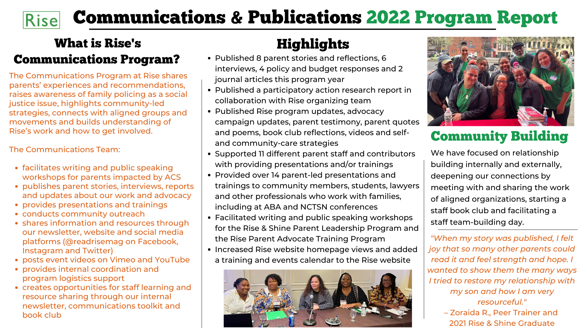 Through our online magazine, publications, website, newsletter and social media platforms (@readrisemag), the Rise Communications Program shares stories by and for parents, provides information and resources, raises awareness of the harms of the family policing system, highlights community-led solutions and offers ways to get involved. The Rise Communications Team facilitates writing and public speaking workshops for parents impacted by ACS, conducts community outreach, supports the Rise team with preparing for presentations and provides internal coordination, logistics support and learning and community-building opportunities. We are excited about the ways we have served as a platform for storytelling and advocacy over the past program year.