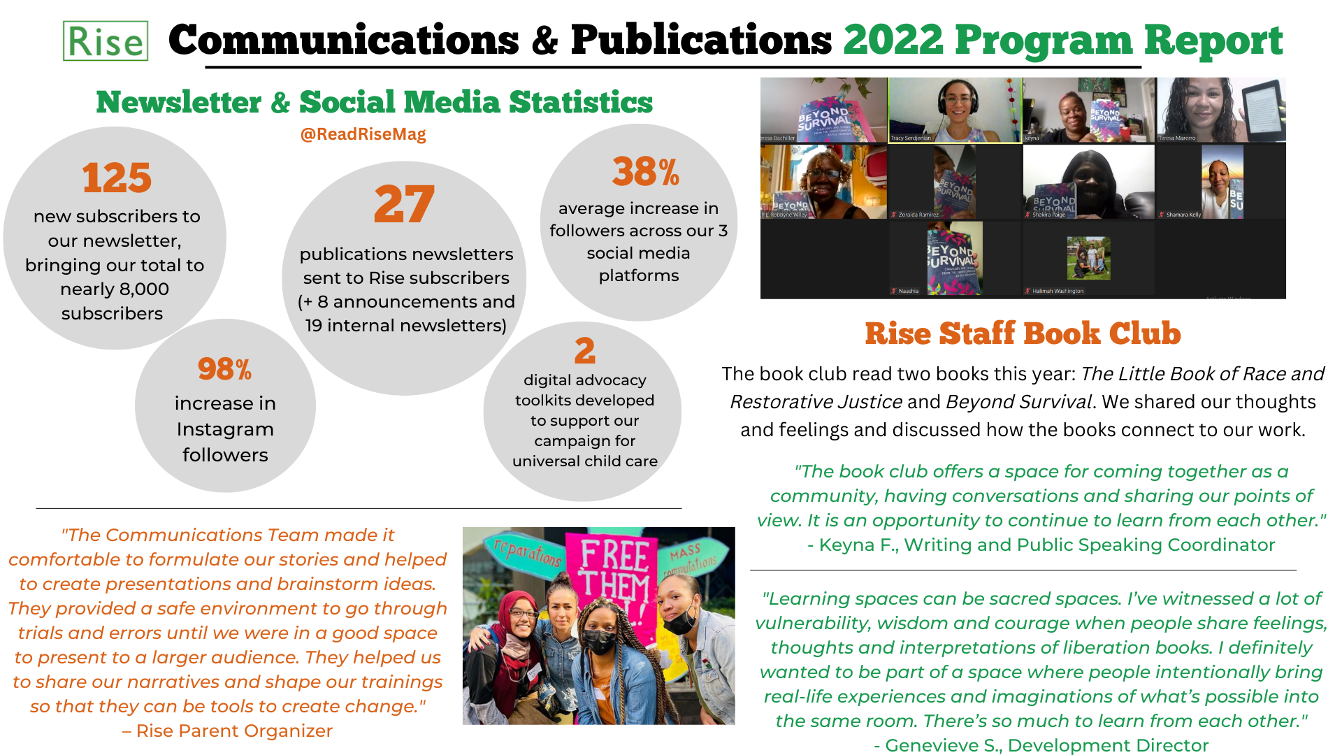 - Published Rise program and advocacy updates; parent testimony, quotes and poems; book club reflections; videos; and self- and community-care strategies