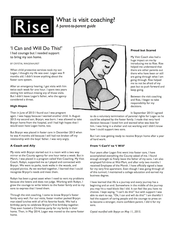Visit Coaching is a service to support parents in making the most of visits with children in foster care. This parent-to-parent guide explains Visit Coaching through two stories by parents — a parent who benefited from coaching, and a parent who reunified with her son and became a Visit Coach. Download and print to hand out to parents who may benefit from Visit Coaching.