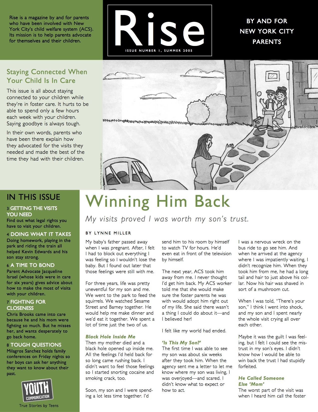 Rise’s very first issue is about staying connected to your children while they’re in foster care. It hurts to be able to spend only a few hours each week with your children. Saying goodbye is always tough. In their own words, parents who have been there explain how they advocated for the visits they needed and made the best of the time they had with their children.