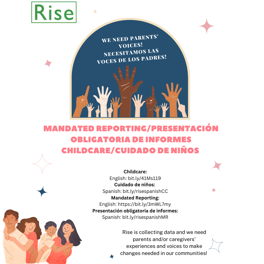 Rise is collecting data to better understand parents’ experiences with reaching out for resources and support from mandated reporters. We’re also collecting data on parents’ and caregivers’ experiences around the lack of child care, accessibility, and what solutions they want to see. This information will remain anonymous and inform Rise’s call to action surrounding our parent-led campaign to expand child care, and include respite care for all NYC families.